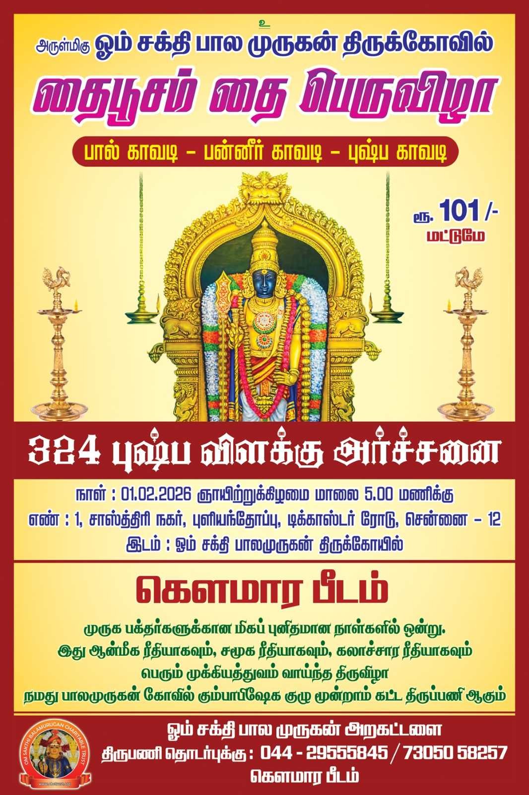 தைப்பூசம் பெருவிழாநமது ஓம்சக்திபாலமுருகன் கோவில் வரும் 01/02/25 அன்று தைப்பூசம் பெருவிழா மாலை 5.00க்கு தொடங்கி,பாலமுருகனுக்கு பால்,பாஞ்சமிதம்,பன்னிர்,அபிஷேகம்,காவடிஆட்டம்,சாமிவிதிஉலா,நடைபெறுகிறது