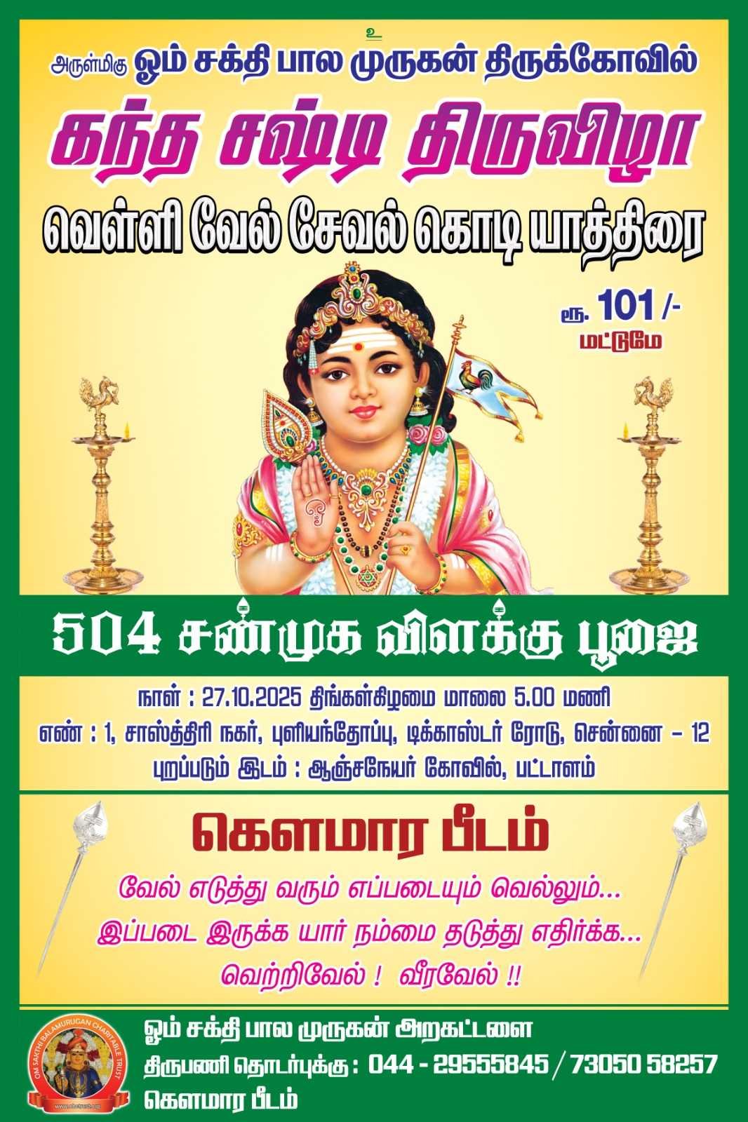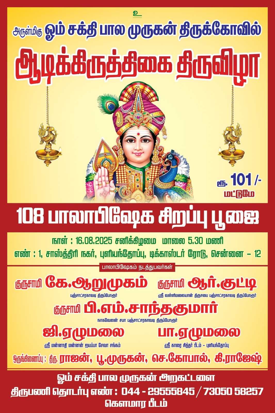 நமது ஓம்சக்திபாலமுருகன் கோவில் வரும் 2026/02/01 அன்று தைப்பூசம் பெருவிழா மாலை 5.00க்கு தொடங்கி பாலமுருகனுக்கு பால்,பாஞ்சமிதம், பன்னிர், அபிஷேகம், காவடி ஆட்டம், சாமிவிதிஉலா, நடைபரேருகிறது அறகட்டளை புதிய 36, உறுபினர்கள் அனைவரும் தங்கள் குடும்பம் அனைவரும் தைப்பூசம் பெருவிழாவில் கலந்துகொளவேண்டும் நமது புதிய உறுபினர்கள் அறகட்டளை மற்றும் கோவில் வளர்ச்சி பாதை வழி கட்டுதல். .நமது கோவில், நமது இலக்கு, ஆறு புதிய உறுபினர் மட்டும் .(முன்றம்படி கொண்டுசெல்ல வேண்டும்)
